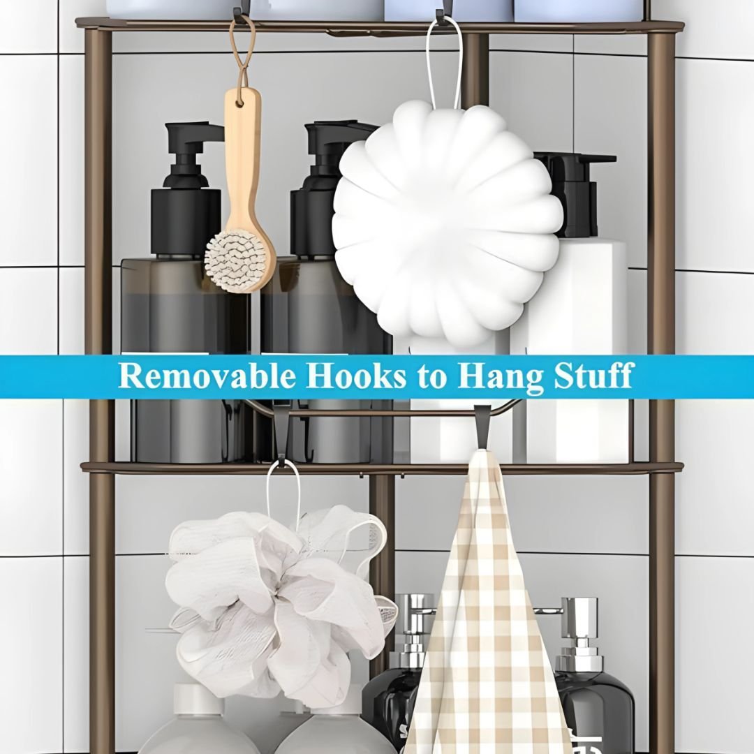 The Floor Standing 3-Tier Shower Caddy Shelf with Hooks is a practical bathroom storage solution designed to fit neatly into any corner. With three open wire shelves, it provides plenty of space to keep your shower essentials organized, including shampoo bottles, conditioner, body wash, and soap.
